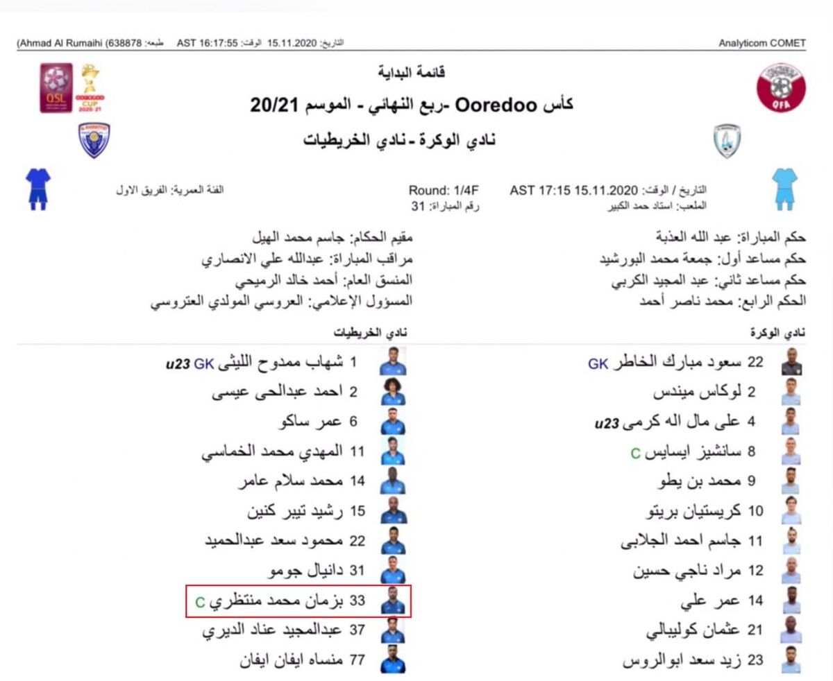 پژمان منتظری که در پنج هفته ابتدایی لیگ ستارگان قطر حضور ثابت در ترکیب الخریطیات داشت ولی در دو دیدار گذشتهشان در رقابتهای جام ستارگان نیمکتنشین بود، امشب مجددا به جمع ۱۱ بازیکن اصلی تیمش مقابل الوکره بازگشت.